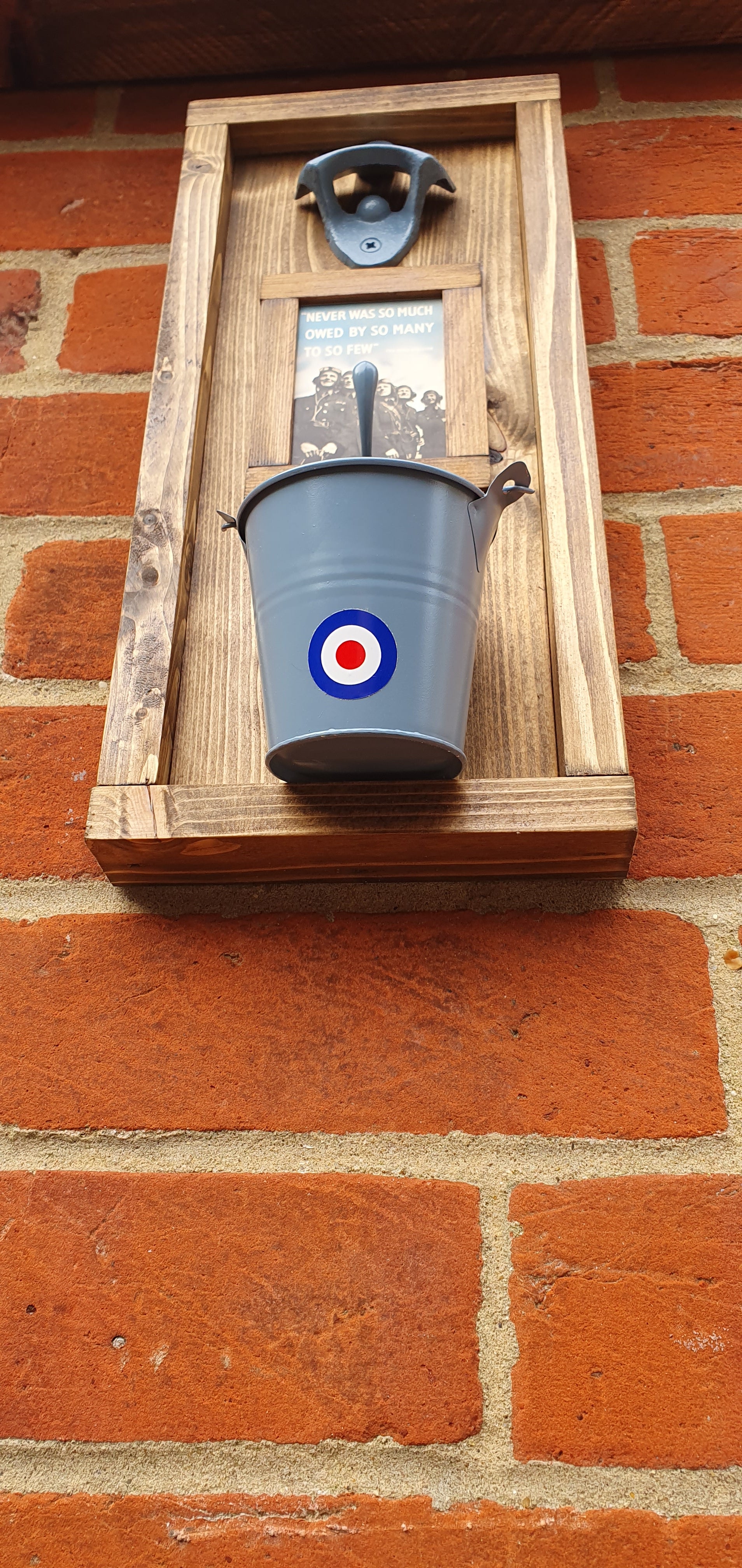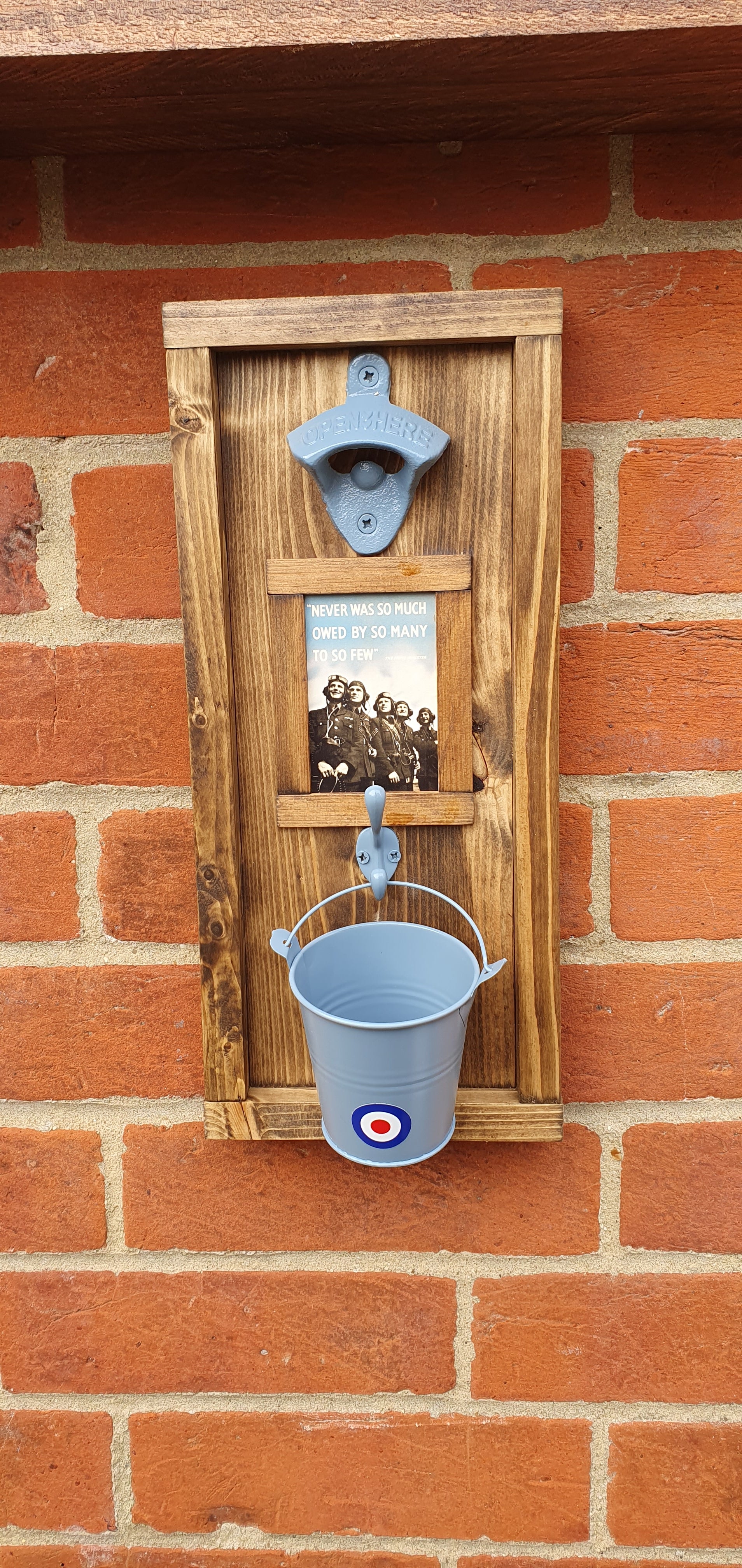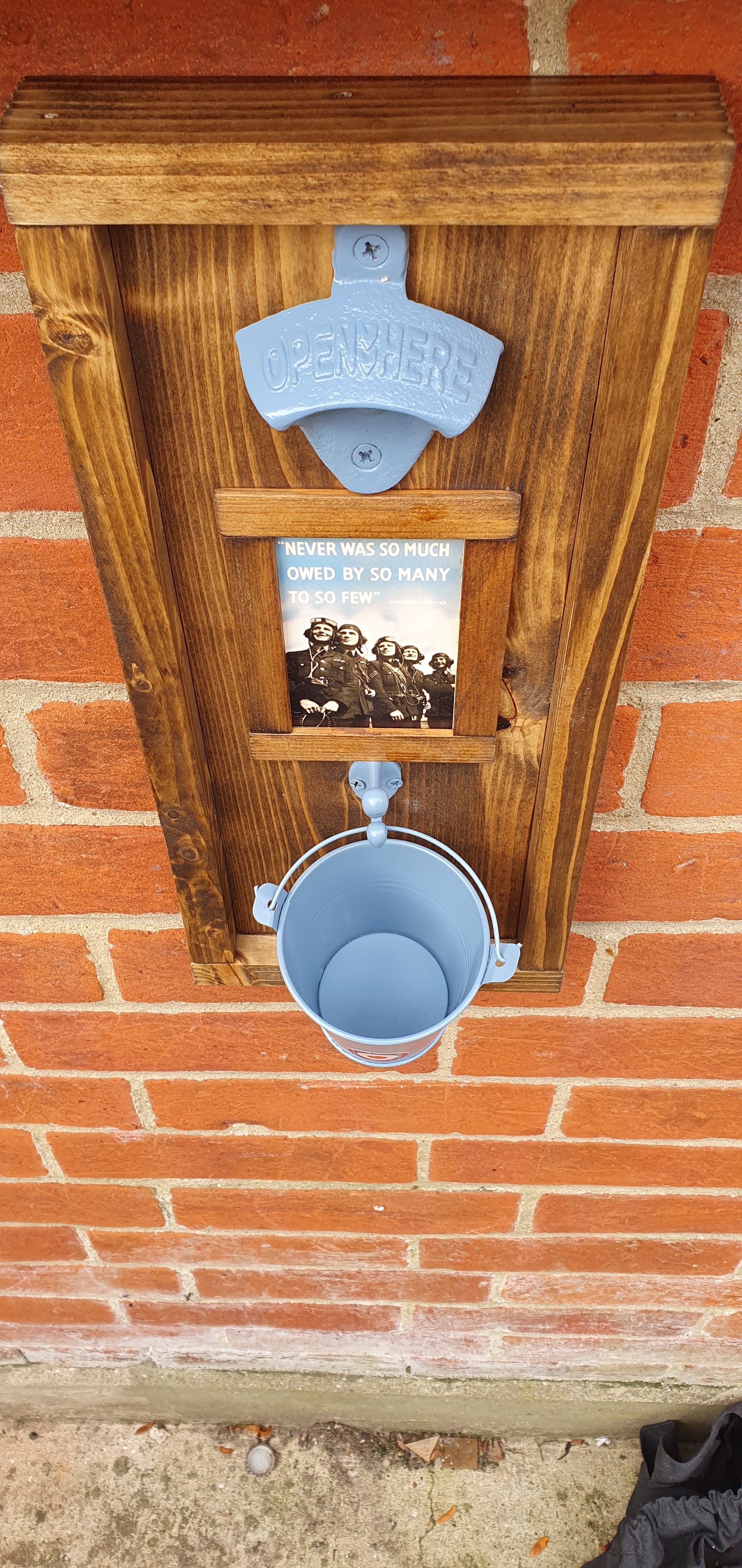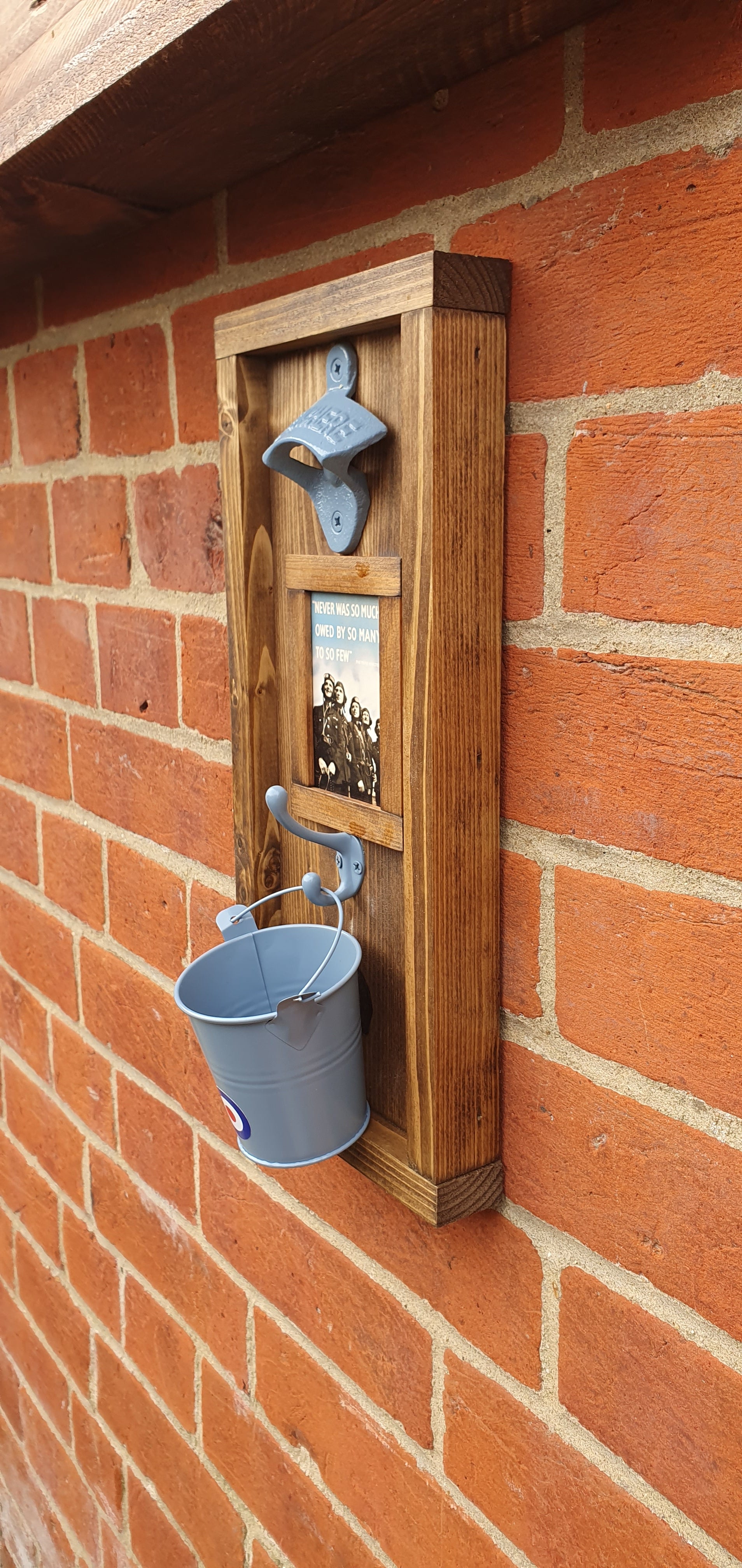These rustic wall mounted bottle openers are designed to suit both an indoor and outdoor setting. The opener itself is made from cast iron, the hook is steel and the bucket cap bin is tin.