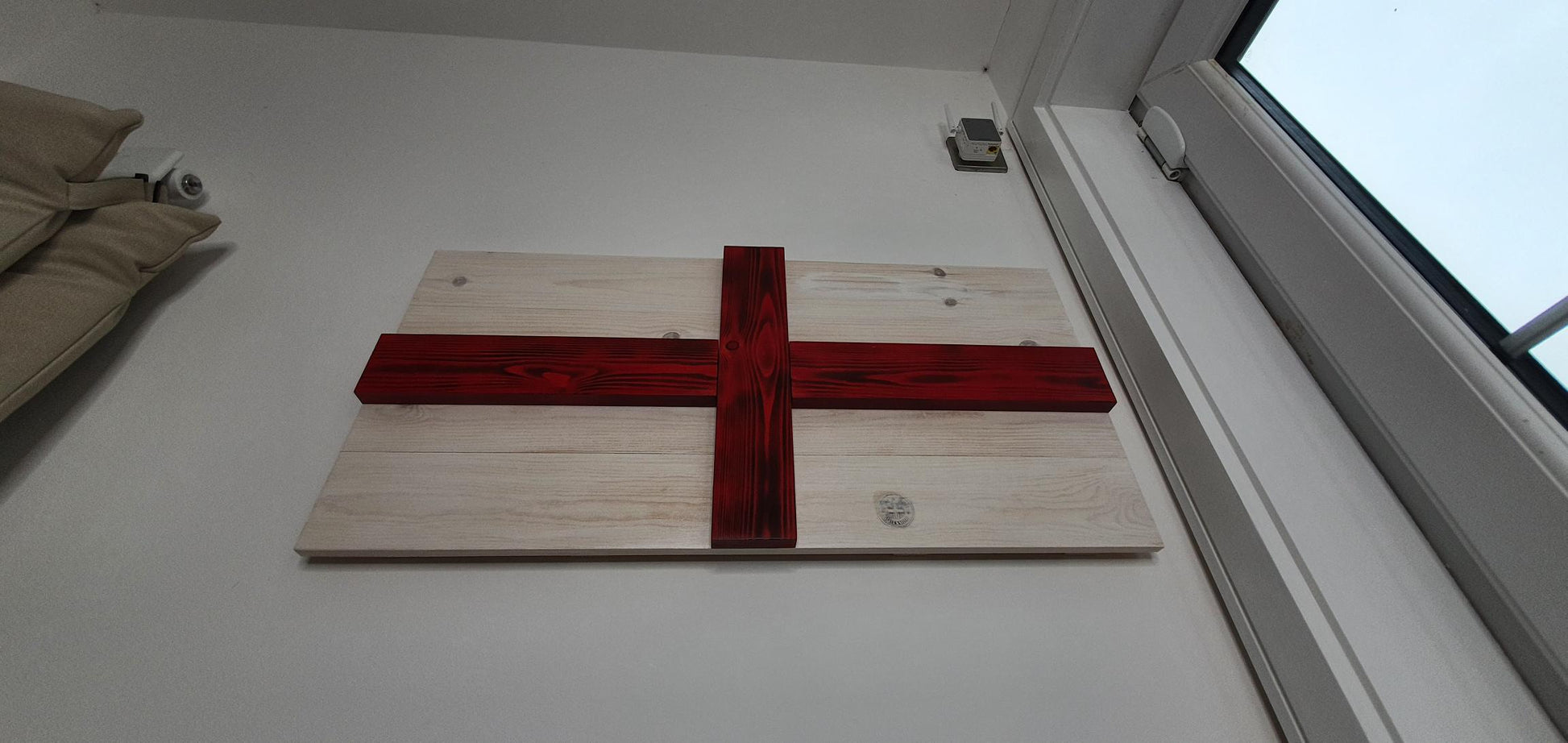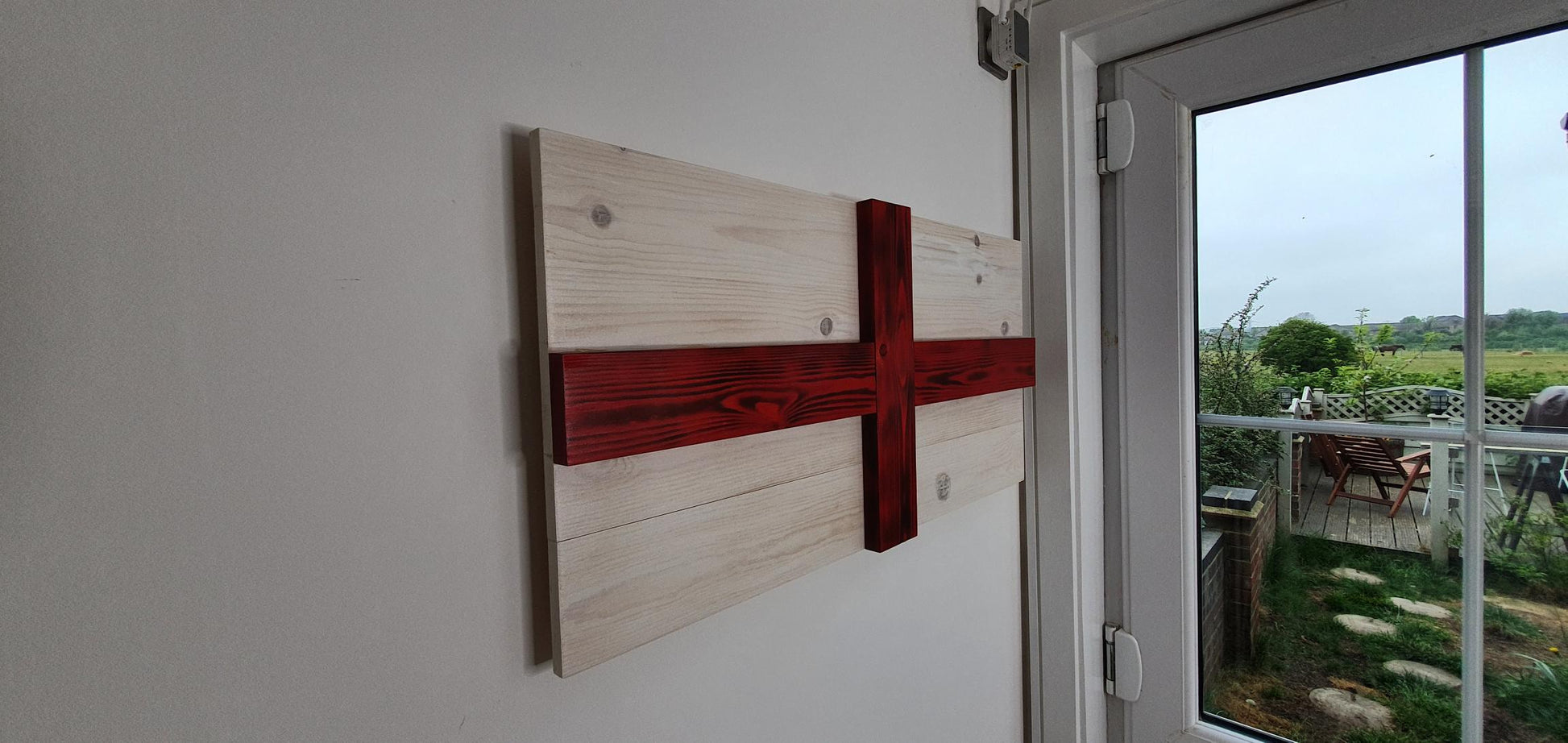 The English flag wall art is made from solid pine, coloured with red wood dye and finished with clear varnish and boiled linseed oil.