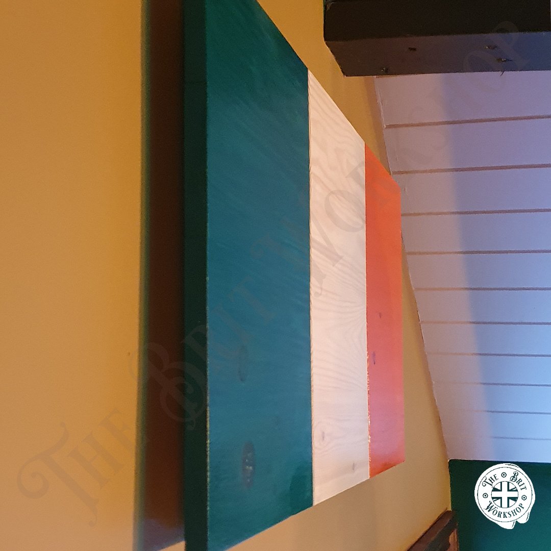 The Irish flag wall art is made from solid pine, coloured with green wood stain, orange wood stain and white wood stain and finished with clear varnish.