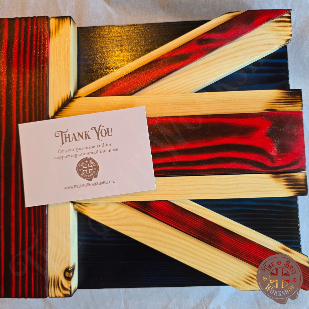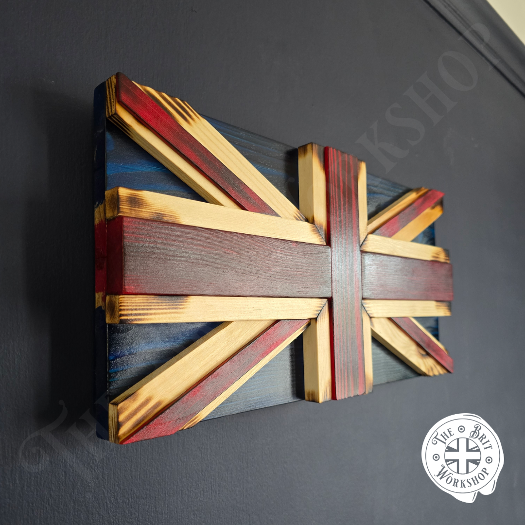 The British flag wall art is made from solid pine, coloured red and blue and finished with clear lacquer.